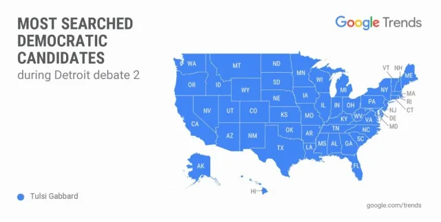 The official social media account of Google Trends posted a map which showed that Gabbard’s name was most sought out in all 50 states.