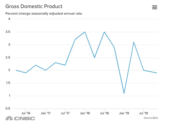 The slight slowing in economic growth comes as trade uncertainty and fears of a manufacturing slowdown sap private business investment in the United States.