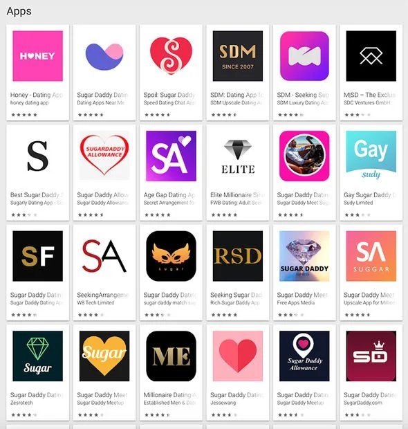 A quick search on the Play Store reveals some 250 apps which claim to enable these transactional relationships. Examples include Sugar Daddy Allowance, Seeking Sugar Daddy, My Sugar Daddy, Seeking Arrangement, Spoil, and Elite Millionaire Singles, to name a few.