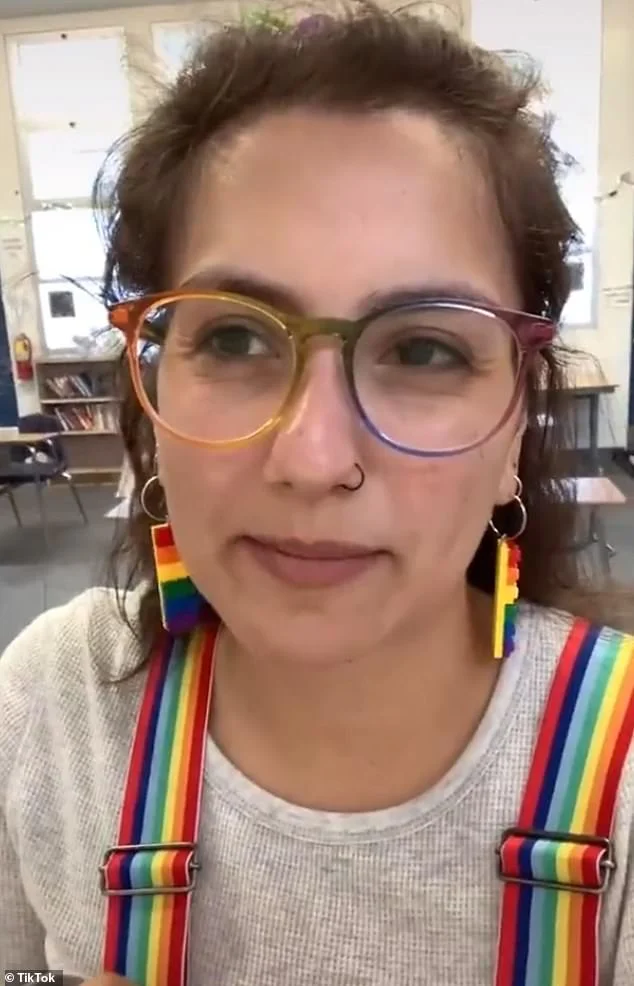 Kristin Pitzen, of Newport Mesa School District in Orange County, said in her viral video, ‘My room does not have a flag,’ before whispering to the camera, ‘because it made me uncomfortable.’