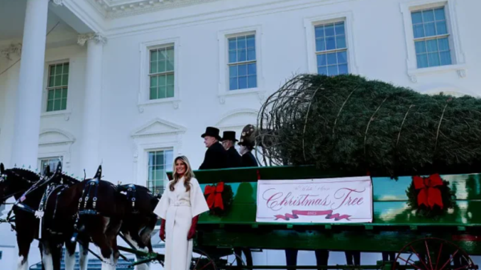 On Monday, the First Lady beamed with joy as the magnificent, towering Christmas tree arrived in grand style — being pulled in on a classic horse-drawn carriage, instantly igniting the holiday spirit in everyone gathered around.
