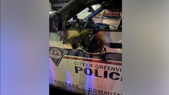 A Greenville police patrol vehicle shows damage to the driver-side door following a shooting