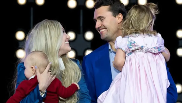 Conservative activist Charlie Kirk is pictured with his wife Erika Kirk on stage at an event earlier this year in Phoenix. (Samuel Corum/Getty Images)