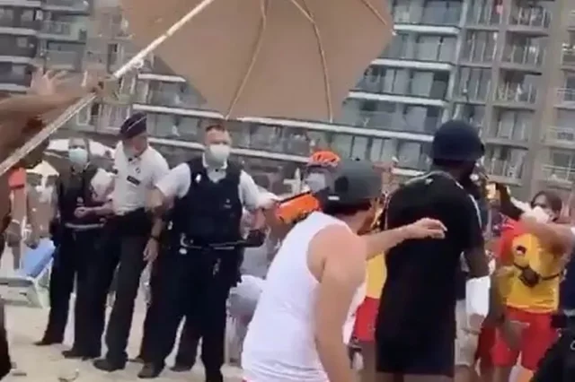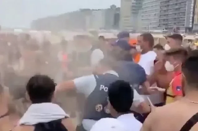 The dramatic scenes were filmed at Blankenberge beach on the Belgian coast where sunseekers clashed with police officers.